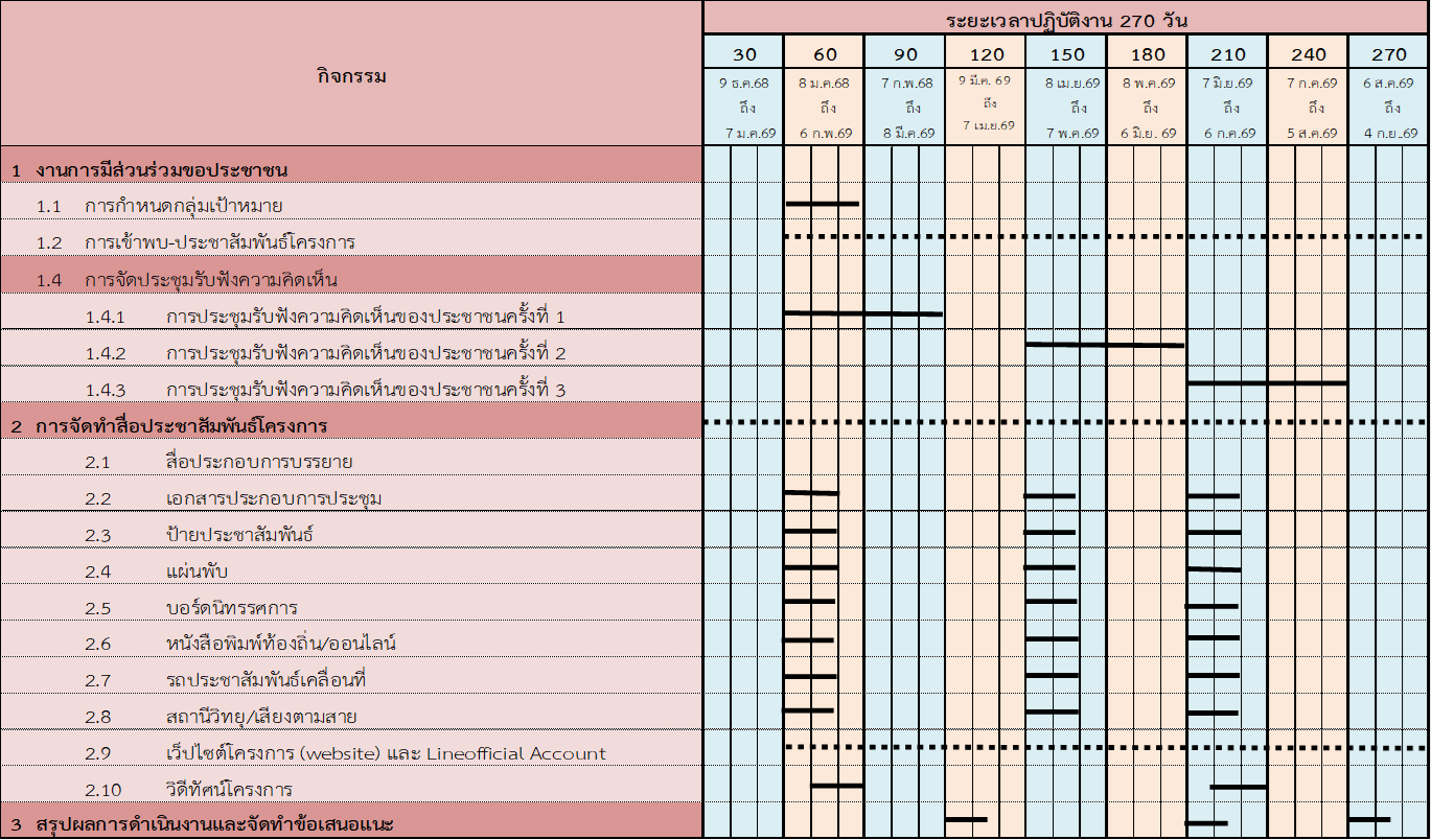 ข่าวสารโครงการแก่หน่วยงานภาครัฐ ภาคเอกชน และประชาชนที่เกี่ยวข้อง ได้รับทราบ อย่างทั่วถึงตลอดระยะเวลาดำเนินโครงการ กรอบระยะเวลาเบื้องต้นของแผนการดำเนินงานด้านการมีส่วนร่วมของประชาชน ดังแสดงในตารางที่ 1